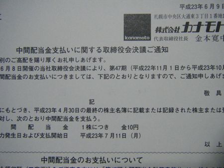 9678 カナモトから、中間配当決議通知が来ました(2011/06/10)